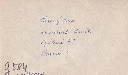 Datováno V Praze 9. června 1960. Adresát: Vážený pan architekt Vaněk, Spálená 47, Praha II. Psáno na kartě po jedné straně modrým perem. Vloženo v originální obálce. Paní Heyrovská sděluje Vaňkovi, která fotografie se manželovi nejvíce líbí, přikládá je a píše číslo zvětšeniny.