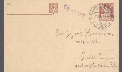 Datováno 31.XII. 21, bez místa odeslání (Lázně Bohdaneč). Razítko, prošlé poštou. Adresát: Pan Ignát Herrmann, spisovatel. Praha II. Václavské nám. 32. Na lístku Herrmannova datumka přijetí: 2 led 1922. Psáno po jedné straně černým perem. Peška informuje Herrmanna, že je Gustav Schmoranz nemocný. Léčí ho dr. Libenský. Prosí ho, aby se za ním zastavil a jemu napsal. Na závěr děkuje za zaslanou knihu.