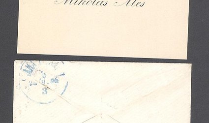 Vizitka Mikoláše Alše, pouze jméno. Originální obálka, známka, razítka, prošlé poštou. Adresát: Slovutný pán, p. Ignát Herrmann, spisovatel v Praze II, Václavské náměstí, č. 32. Psáno po jedné straně černým perem. Datováno Dne 28. září L.P. 1904. Datumka přijetí vizitky Herrmannem: 29.9. 1904. Na vizitce kresbička Mikoláše Alše, svatý Václav a poděkování. Podepsán malíř a jeho syn Tomáš Aleš.