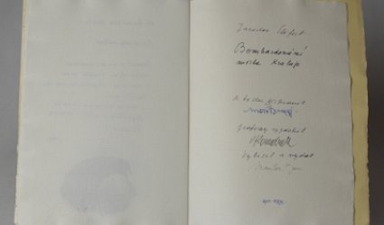 Praha, Jan Mauler, 1982. OBr., volně vložené archy, nestr. (70 s.). Faksimile rukopisu Jaroslava Seiferta. 7 originálních leptů signovaných tužkou a ilustrace Vladimír Komárek. Všechny ilustrace podpsány výtvarníkem. Typografická úprava Matúš Jurák. V tiráži podpisy Vladimíra Komárka, Matúše Juráka a Jana Maulera. Celkem 30 výtisků na ručním losínském papíře. Tento výtisk autorský.