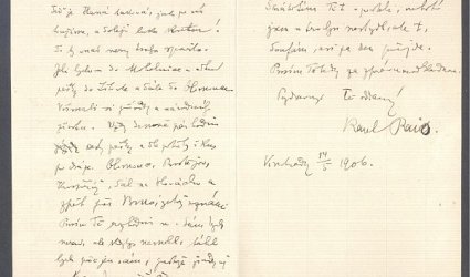 Vinohrady 14/5 1906. Psáno na dopisním papíře po třech stranách černým perem. Na první straně napsán Herrmannem tužkou datum přijetí dopisu: 15/5 906. Rais se ptá, zda s ním Herrmann pojede na Moravu. Píše termín své dovolené a popisuje trasu, kudy se vydají.