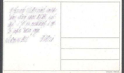 Pohlednice s reprodukcí Bílkovy kresby. Vzadu přání pro JUC. Jaromíra Uhlíře. Datováno Velikonoce 1921. Psáno po jedné straně modrým perem, podepsáno přejí Bílkovi.