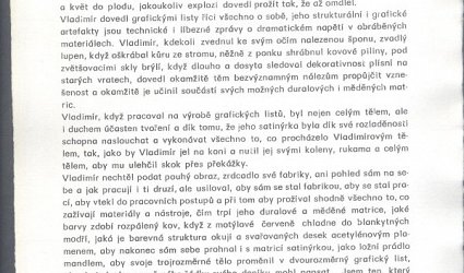 Praha, n.vl., 1988. Soukromý neprodejný tisk. Clpl. pouzdro, 1 s. textu + 46 volně vložených grafických listů různých technik a rozměrů. Vše signováno tužkou, některé listy datovány a číslovány. Autoři: Milan Albich, Jaroslav Alt, Mikuláš Axmann, Marie Blabolilová, Bořivoj Borovský, Zdeněk Bouše, Miroslav Bravenec, Tomáš Coufal, Zdeněk Cupák, Josef Černý, Jiří Ernest, Miroslav Fišák, Dobroslav Halata, Oldřich Hamera, Josef Hampl, Petr Hampl, Pavel Hlavatý, Helena Horálková, Jiří Hůla, Zdeněk Hůla, Jan Jemelka, Josef Jíra, Ditta Jiřičková, Jana Kadlecová, Vladimír Komárek, Aleš Krejča, Alena Kučerová, Jiří Lindovský, Jan Lodr, Mikuláš Lubomírský, Dalibor Matouš, Jan Moravec, Jiří Mika, Zuzana Nováčková, Jiří Pálek, Karel Prášek, Karel Pucherna, Dana Puchnarová, Miroslav Stuchlík, Matěj Svoboda, Ivan Špirk, Cyril Urban, Zdeněk Veselý, Lenka Vilhelmová, Helena Wernischová, Karel Zavadil. Text Bohumil Hrabal. Redakce Ivan Hrdina. Typografie Vladimír Schmiedt. Pouzdro Jan Žalman. Celkem 55 neprodejných výtisků, tento č. 36. Pod textem podpis Bohumila Hrabala modrým perem !