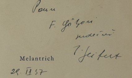 Praha, Melantrich, 1937. OBr., nestr. (19 s.). Ilustrace Josef Čapek. Na titulním listě věnování Jaroslava Seiferta z 28. IX. 37. Kromě běžného vydání vyšlo 50 číslovaných výtisků na ručním pap. Vergé Blanc Pannekoek. Tento výtisk obyčejný.
