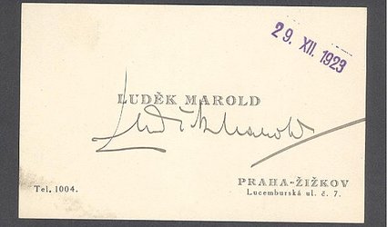 Vizitka malíře: Luděk Marold, Praha-Žižkov, Lucemburská ul. č. 7., Tel. 1004. Nedatováno. Marold přeje Herrmannovi všechno dobré v příštím roce. Psáno po jedné straně černým perem. Podpis Luďka Marolda u vytištěného jména. Na vizitce datumka: 29.XII. 1923, datum zařazení viizitky Herrmannem do osobního archivu. Na mnoha písemnostech se objevují spisovatelovi poznámky o založení písemností do archivu s pozdějším datem, než byly přijaty, viz dopis Svatopluka Čecha z 7/6 1891.