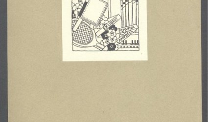 Ex Libris Edwina Campbell. Tenisová raketa, kniha, varhany, květy.