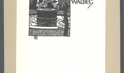 Ex Libris Jindřich Waldes. Kašna se 3 nymfami, tančícími na pokraji basénu.