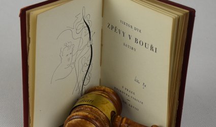 Praha, Dr. Štěpán Jež, 1928. Vigilie svazek 1. (v tiráži mylně třetí). Clkož. vazba s ražbou a zlacením, kapitálek, zlatá ořízka. 76 (1) s. Vázal Ludvík Bradáč. Ilustroval A.V. Hrska. Na titulním listě podpis Viktora Dyka. Celkem 500 výtisků, z toho 150 na ručním pap. van Gelder a 50 na pravém japanu. Výtisky na van Gelderu a japanu jsou číslovány a podepsány autorem. Tento výtisk jeden ze 150, č. 64.