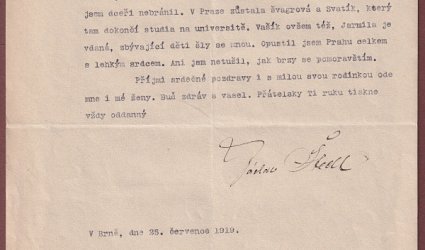 Datováno v Brně, dne 25. července 1919. Psáno na stroji na dvou listech, podpis černým perem. Na prvním listě Herrmannova datumka: 27 červrce 1919. Štech přeje rozkvět nově vzniklému Československu. Momentálně je v jednom kole, chystá se otevření Městského divadla. V Brně se mu žije výborně, Prahu opustil celkem s lehkým srdcem. V Praze zůstala jeho žena, syn Vašek (V.V. Štech), švagrová a její syn Svatík. Ostatní děti šly s ním. Dcera Mařenka, která se stala v Brně profesorkou vyšší dívčí školy, dostala dekret ředitelky vyšší průmyslové školy v Turčianskem Sv. Martině. Odchází tedy na Slovensko. Je rád, že ji zde bude do úřadu uvádět Mareš, tvůrce spolku Vesna.