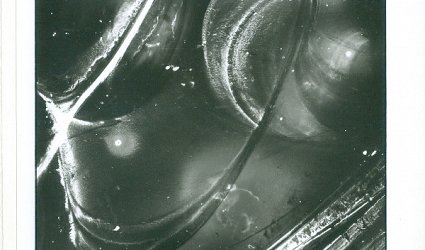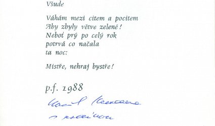 Arch papíru, karton. Vlevo báseň Ludvíka Kundery Štědrý večer. Vpravo montován originální fokalk od Miloše Koprečka 14,5 x 12,2 cm. Pod básní podpis Ludvíka Kundery modrým perem.