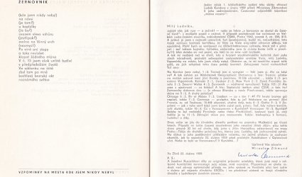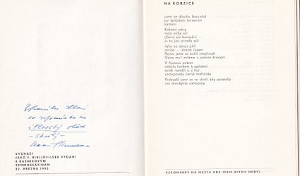 Bez místa vydání (Brno), n. vl., 1990. OBr. s reliéfním tiskem, volně vložené listy, nestr. (17 s.). Vložen reliéfní tisk Josefa Ruszeláka XXXIX. Signováno, datováno a číslováno tužkou. Na poslední straně otištěn dopis cestovatele Miroslava Zikmunda. Pod dopisem podpis modrým perem. Grafická úprava a obálka Josef Ruszelák. Na patitulu věnování básníka Bohumilu Illovi. Na obálce podpis Ludvíka Kundery modrým perem. 2. bibliofilské vydání k básníkovým sedmdesátinám. Tento výtisk č. 125/150.