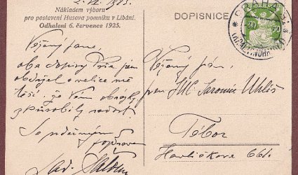 Datováno 2. VI. 1925. Bez místa odeslání, dle razítka Praha. Známka, prošlé poštou. Adtresát: Vážený pán, pan JUC. Jaromír Uhlíř, Tábor, Havlíčkova 661. Psáno černým perem. Šaloun obdržel oba Uhlířovy dopisy. Je rád, že mu zaslané obrázky způsobily radost. Dopisnice byla vydána výborem pro postavení Husova pomníku v Libáni. Odhalení 6. července 1925. Na líci fotografie návrhu pomníku od Ladislava Šalouna.