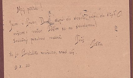 Datováno 9.X. 20., bez místa odeslání (Praha). Razítka, známka, prošlé poštou. Datumka přijetí: 11 říj. 1920. Adresát: Pan Ignát Herrmann, spisovatel. Praha II. Václavské nám. Peška píše, že je v Praze. Informuje Herrmanna, kdy ho zastihne doma. Ptá se zda ví, že zavřeli Bristolku. Na závěr pozdravuje rodinu a těší se na shledanou. Psáno po jedné straně černým perem.