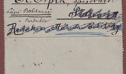 Dopisnice. Razítka, známka, prošlé poštou. Adresát: Pan K. Šípek, spisovatel. Lázně Bohdanwč u Pardubic. Adresa do redakce Národní politiky přeškrtnuta. Bez data a místa odeslání, dle razítek Praha, 3.II. 20. Psáno po jedné straně černým perem. Anonymní pisatel popisuje aféru poslance Viktora Hübnera. Podepsáno spisovatelovým pseudonymem.