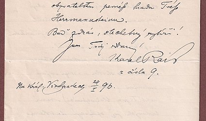Datováno Na Král. Vinohradech 29/I 96. Psáno na dopisním papíře po dvou stranách černým perem. Na první straně dvě datumky napsané Herrmannovou rukou: modrou pastelkou 29/I 1896 a tužkou 30/I 96 (datum přijetí dopisu a den odepsání). Rais děkuje za zaslání stanov Spolku českých spisovatelů beletristů Máj. Nechtěl Herrmanna obtěžovat, přišel by si pro ně. Potřebuje je pro jednoho chorvatského spisovatele ze Záhřebu. Omlouvá se tedy, že je už nevrátí.