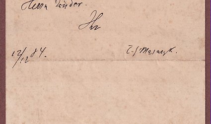 Datováno 12/12 84, bez místa odeslání. Psáno na dopisním papíře po třech stranách černým perem. Text německy. Masaryk nabízí nakladateli rukopis své knihy Janow. Požaduje honorář 4000 zlaté.