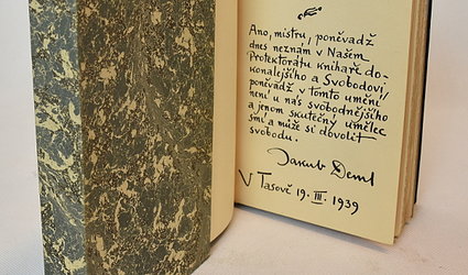 Tasov na Moravě, Marie Rosa Junová, 1939. Clkož. vazba s ražbou a zlacením, zlatá ořízka, pap. obálka vevázána, fólie. Kartonové pouzdro. 136 (1) s. Vázal Jindřich Svoboda v roce 1940. Na předsádce exlibris Jindřicha Svobody. Obálka a frontispis Jakub Obrovský. Za titulním listem věnování Jakuba Demla Jindřichu Svobodovi s datem V Tasově 19.III. 1939. Tisk na ručním papíře Holland Pannekoek.