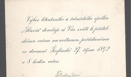 Dva autogramy nalepené na pozvánce literárního výboru a řečnického spolku Slavia. Růžena Viková-Kunětická a Antal Stašek. Poznámka Herrmanna: "o 1/3 zmenšit! 18/XI 1892". Vše psáno černým perem.