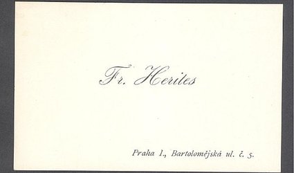 Vizitka: Fr. Herites, Praha I, Bartolomějská ul. č. 5. Psáno po jedné straně černým perem, datováno Herrmannem tužkou: 9/11 904. Herites posílá další tisky za zadané ceny a vyjmenovává tituly, které ještě má.