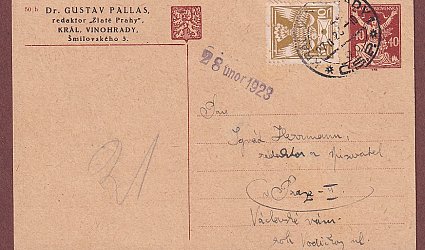 Datováno V Praze 27.II. 1923. Známka, razítko, prošlé poštou. Adresát: Pan Ignát Herrmann, redaktor a spisovatel v Praze - II, Václavské nám., roh Vodičkovi ul. Odesílatel: Dr. Gustav Pallas, redaktor "Zlaté Prahy", Král. Vinohrady, Šmilovského 3. Na lístku Herrmannova datumka přijetí: 28 únor 1928. Psáno po jedné straně černým perem. Pallas děkuje Herrmannovi za dopis, kterého si velmi si ho váží. Uchová jej ve své sbírce jako jeden z nejvzácnějších autografů a často se k němu bude vracet.