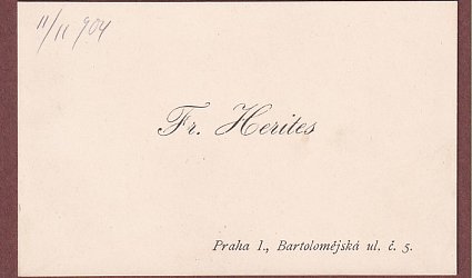 Vizitka s tištěným jménem a adresou spisovatele. Nedatováno. Na líci napsáno tužkou datum přijetí: 11/11 904. Herites posílá poslední rukopisy, které mu byly dodány pro cenu Akademie.
