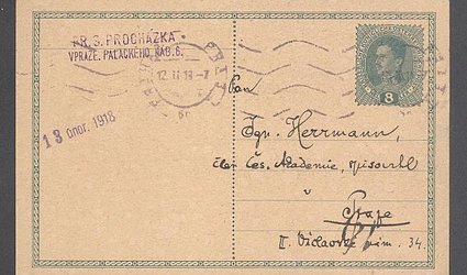 Datováno V Praze 12/2 18. Adresát: Pan Ign. Herrmann, člen Čes. Akademie, spisovatel v Praze II., Václavské nám. 34. Vlevo nahoře razítko s Procházkovou adresou a datumka přijetí lístku, 13 únor 1918. Razítka, prošlé poštou. Psáno po jedné straně černým perem. Procházka děkuje za zaslání bylinného lektvaru, který mu pomáhá. Dále děkuje za intervenci a popisuje moravský večírek. Na závěr zve Herrmanna ke Gráfovi a připomíná mu, že mu slíbil knihu.
