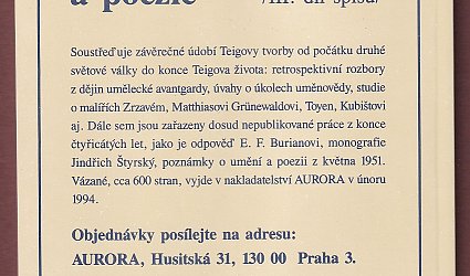 Praha, Surrealistická skupina, 1993. OBr., 67 s. Faksimile 1. vydání z roku 1938. 1. příloha Jarmarku umění, nepravidelného členského zpravodaje Společnosti Karla Teiga. Neprodejný výtisk.