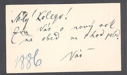 Vizitka Dr. Julia Grégra, pouze natištěné jméno. Bez místa odeslání (Praha), nedatováno. Dle poznámky Herrmanna modrou pastelkou rok 1886. Grégr zve Herrmanna na nový rok na oběd. Psáno po jedné straně černým perem.