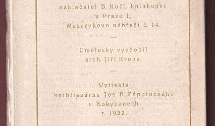 Praha, B. Kočí, 1922. Umělecké Snahy svazek 256. OBr., 106 (6) s. Obálka a titulní list arch. Jiří Kroha.
