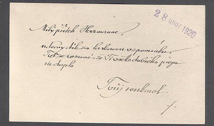 Vizitka s natištěným jménem. Bez místa odeslání (Praha), nedatováno. Dle datumky Herrmanna přijato 28. února 1920. Čapek-Chod děkuje za milou vzpomínku. Psáno po jedné straně černým perem.