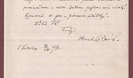 Datováno V Sobotce 21/VII 96. Psáno na sešitovém papíře po třech stranách černým perem. Na první straně Herrmannova poznámka modrou pastelkou: "došlo 23/VII 1896". Rais popisuje svůj pobyt v Sobotce, svěřuje se se svými vnitřními pocity. Je znechucen lidmi a světem. Vzpomíná na Herrmanna, na Máj (Spolek českých spisovatelů beletristů Máj) a gratuluje Herrmanovu synovi iDaliborovi. Na závěr se ptá na 2. sešit "Za světem". Pozdravuje Antonína Klášterského, Černého a Herrmannovu choť.