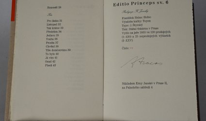 Praha, Erna Janská, 1933. Editio Princeps svazek 6. OBr. s aplikovaným štítkem, kartonové pouzdro. 43 (3) s. Tři litografie Toyen. Typografická úprava Jindřich Štyrský. V tiráži podpis Františka Halase. Celkem 145 číslovaných výtisků na ručním papíře Pannekoek. Výtisky číslo 1 - 120 prodejné, výtisky I - XXV neprodejné. Tento výtisk č. 51 !