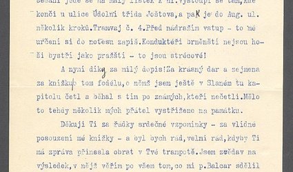 Psáno na dopisním papíře s hlavičkou Václava Štecha, Brno, Veveří 77, Konečného nám. 3. Radí Herrmannovi, aby napsal panu dr. Novotnému v Brně, který umí léčit lišej ozařováním. Vyprávěl mu o tom pan podnikatel Balcar, kterého tak Novotný uzdravil. Popisuje pak příběhy několika lidí, kteří se tak uzdravili. Popisuje Herrmannovi cestu vlakem a tramvají. Nabádá ho naléhavě, aby přijel. Pokud mu dá vědět, přijde na nádraží. Na závěr děkuje za zaslané knihy. Psáno po čtyřech stranách na stroji, podpis černým perem. Na první straně Herrmannova poznámka červeným perem: "do Řev. 30/9 1926. Odpověď 2/10 26, díky za sdělení, selže-li praž. léčení, pojedu do Brna."