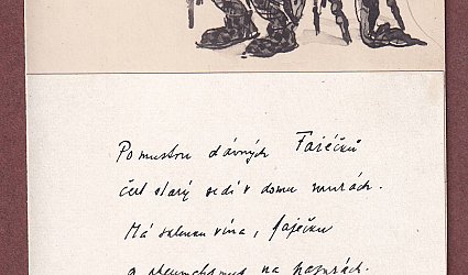 Pohlednice s kresbou ještěra. Bez údajů. Pod reprodukcí napsány dva verše, na zadní straně adresát: Pan Ignát Herrmann v Praze. Psáno černým perem.