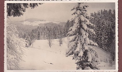 Pohlednice Slezských Beskyd. Bílý kříž v zimě. Bez údajů. Adresát: Pan Ignát Herrmann v Praze II, Václ. 32. Známka, razítko, prošlé poštou. U známky Herrmannova datumka přijetí: 24. XII. 1933. Psáno černým perem. Bezruč přeje Herrmannovi vše nejlepší v roce 1934.
