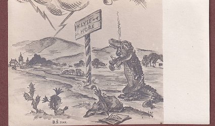 Pohlednice s kresbou od D. Š. Pinxe. Bez údajů. Adresát: Pan Ignát Herrmann v Praze. Na pohlednici napsány verše černým perem. Pod nimi nalepena ještěrka jako podpis.