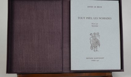 Paris, Éditions maintenant, 1972. OBr., volně vložené archy v clpl. pouzdře s ražbou. Nestr. (16 s.). Vložena originální suchá jehla od Toyen. Signováno tužkou vpravo dole. Návrh pouzdra Toyen. V tiráži podpis autorky černým perem. Celkem 75 číslovaných výtisků na ručním papíře Ingres. Tento číslo 58.