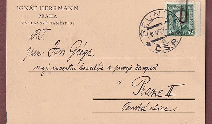 Konvolut dvou dokumentů. I. Korespondenční lístek s hlavičkou Ignáta Herrmanna. Známka, razítko, prošlé poštou. Adresát: P.T. pan Jan Grégr, maj. insertní kanceláře a prodeje časopisů v Praze II, Panská ulice. Datováno T. č. v Řevnicích 19/8 1927. Herrmann žádá Grégra, aby mu obstaral dva kusy časopisu Das Weltbild, č. 32. Jakmile bude v Praze, zastaví se pro ně. Psáno černým perem. Na líci razítko Jana Grégra. II. Potvrzení insertní kanceláře Jana Grégra o vydání korespondence. Datováno 24/II. 1927. Psáno černým perem. Sepnuto dobovou kancelářskou sponkou.