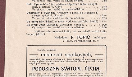 Praha, F. Topič, b.d. OBr., nestr. (6 s.). Na titulu podobizna spisovatele a faksimile podpisu. Obsahuje seznam titulů vydaných v nakladatelství F. Topič včetně cen.