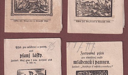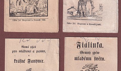 1. Píseň o krásné Amalii. 2. Nová píseň mládencům a pannám, k zpěvu vydaná. 3. Kratochvilná píseň pro mládenci a panny. 4. Kratochvilná píseň pro mládenci a panny. 5. Píseň o živobytí člověka. 6. Nový zpěv všem svobodného stavu, pro obveselení mysle a utrácení času na světlo vydaný. 7. Nová píseň pro mládenci a panny pro ukrácení chvíle vydaná. 8. Jarni zpěv pro mládež, k ukrácení času na světlo vydaný. 9. Píseň navracejícího se vojína. 10. Fialinka. Jenmý zpěv mladému světu. 11. Fialinka. Jemný zpěv mladému světu. 12. Nová píseň pro mládenci a panny, o krásné Fanynce. 13. Zpominka na milence. Kratochvilná píseň pro mládence a panny. 14. Loučení milenky. 15. Žertovná píseň pro obveselení mysle mládenců i pannen. 16. Píseň pro mládenci a panny, aneb psani lásky. 17. Píseň o loučení mládence. 18. Nová světlá píseň. Rozmlouvání ožralce s ženou svou. Litomyšl, Fr. Bergr, Ant. Augusta, Jos. Bergreová, 1851, 1853, 1855, 1855, 1855, 1856, 1856, 1858, 1864, 1865, 1865, 1865, 1866, 1866, 1867, 1869, 1869, b.d. 18. svazek bez údajů. OBr., archy papíru, nestr. (6 s., 7 s., 6 s., 6 s., 6 s., 7 s., 6 s., 6 s., 6 s., 6 s., 6 s., 6 s., 7 s., 6 s., 5 s., 6 s., 7 s., 6 s.) Na všech výtiscích mědirytiny. Některé svazky nerozřezány, na některých poznámky tužkou.
