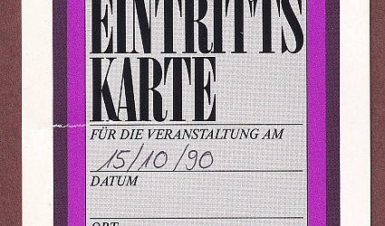 Vstupenka na akci v knihkupectví Rumbach Center ve Freiburgu.. Karta s koláží 14,5 x 7,5 cm. Datováno 15/10/90, 20.00 hod. Vstupenka č. 72. Natrženo. Podpis Pavla Kohouta modrým perem.