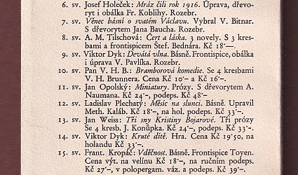 Praha, Dr. Štěpán Jež, 1934. Vigilie svazek 15. OBr., 59 (3) s. Ve frontispisu ilustrace od Toyen. Na předsádce podpis autora. Celkem 500 výtisků, z toho 70 na ručním papíře Pannekoek. Tento výtisk na velínu.