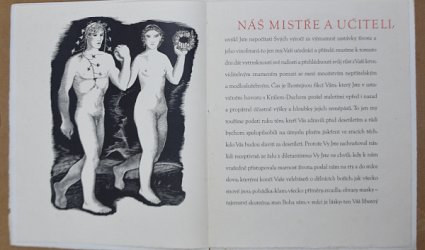 Praha, Dr. Bohumír Lifka, 1927. OBr., nestr. (5 s.). Dřevoryt ve frontispisu a typografická úprava Karel Svolinský. Celkem 150 číslovaných výtisků na ručním papíře van Gelder. Tento výtisk č. 101. V tiráži podpis Karla Svolinského a nakladatele.