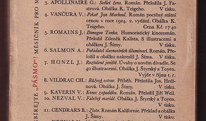 Praha, Jan Fromek, 1925. Odeon svazek 1. OBr., 212 s. Obálka Karel Teige. Kromě běžného vydání vyšlo 60 číslovaných a 40 nečíslovaných výtisků na pap. Japan Banzay. Tento výtisk nečíslován.