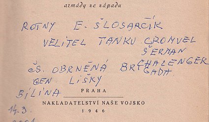 Praha, Naše vojsko, 1946. Boj a odboj svazek 3. OBr., 86 s. Obálka Otto Treichlinger. Čb. hlubotiskové přílohy. Třetí díl trilogie "Tři fronty odboje". Na titulním listě věnování rotného Emila Šlosarčíka, velitele tanku Cromwel.