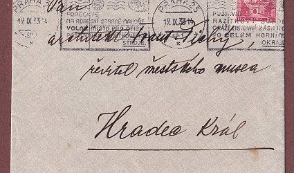 Vloženo v originální obálce. Razítka, známka, prošlé poštou. Adresát: Pan architekt Frant. Tichý, ředitel městského musea, Hradec Králové. Odesílatel: V. Beneš, Praha 48, čp. 492. Datováno Praha 18/9 33. Psáno na dopisním papíře po jedné straně černým perem. Beneš děkuje za rám a za knihu. Na oplátku posílá svou monografii, která právě vyšla. Dále píše o své probíhající výstavě, na které Moderní galerrie zakoupila dva obrazy. Stěžuje si ale, že mu dosud nezaplatili obraz z loňska. V té souvislosti prosí Tichého o proplacení složenky. Vložen reklamní leták na monografii.