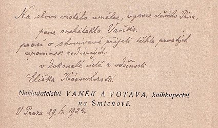 1. Z mého mládí. Praha, Vaněk a Votava, b.d. (1920). Clpl. vazba s kresbou, 199 (1) s. Na titulním listě věnování spisovatelky architektu Vaňkovi. Psáno černým perem, datováno V Praze 29. 6. 1924. 2. Dopis pro architekta Jindřicha Vaňka. Datováno V Praze dne 29. června 1924. Psáno na dopisním papíře po jedné straně černým perem. Krásnohorská děkuje za portrétování pro Máj a dovoluje si věnovat svou knihu vzpomínek. Vloženo v originální obálce..