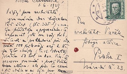 Fotopohlednice s portrétem spisovatele. 13,5 x 8,6 cm. Známka, razítko, prošlé poštou. Adresát: Pan architekt Vaněk, fotogr. atelier, Praha I, Národní tř. 23. Psáno černým perem. Datováno Horní Černošice 1. 6. 1929. Horký zasílá Vaňkovi honorář za fotografie. Komentuje cenu, která je pro umělce moc vysoká. Podpis na první straně fotopohlednice.
