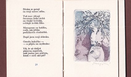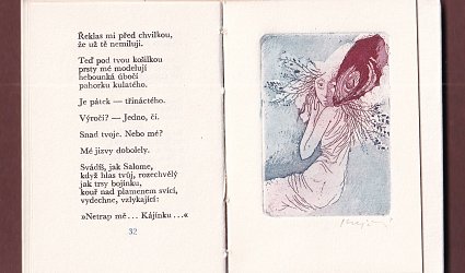 Praha, Nadace Lyry Pragensis, 1991. Polyhymnia svazek 66. Lyra Pragensis svazek 207. OBr., fólie, 37 s. Čtyři barevné kombinované techniky signované tužkou Zdeňka Krejčová. Typografická úprava Vladimír Viener. Slepotiskové razítko Lyry Pragensis v tiráži. Část nákladu vázána ve vazbě Zdeňky Králové. Celkem 200 číslovaných výtisků na papíře Hollar. Tento výtisk č. 89/200.
