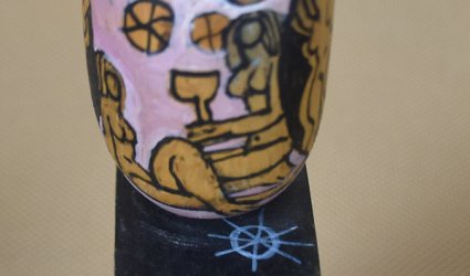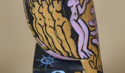 Dřevěný ptáček na dřevěném soklu 16,5 x 7 cm. Pomaloval Miroslav Houra. Signováno a datováno vespod soklu. Rok 2003. Vyřezal Eduard Šmejkal.